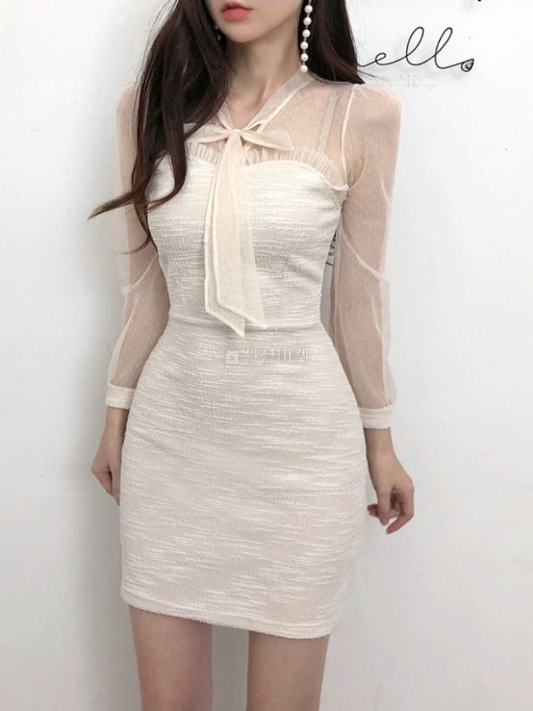 메르비원피스)망사배색리본타이슬림미니원피스룩 낱장 여부 상품등록정보